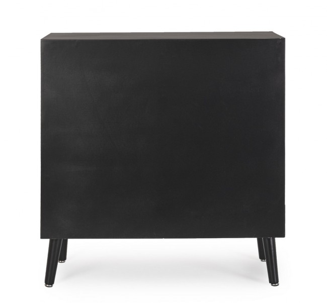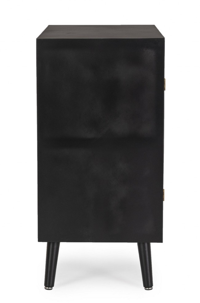 Scopri la credenza Josine: struttura e gambe in legno di pino con frontali e cassetti in MDF arricchiti da eleganti inserti in rattan per un tocco naturale. Finitura nera a base nitrocellulosica, maniglie in acciaio e gambe da montare per un mix perfetto di stile e praticità.