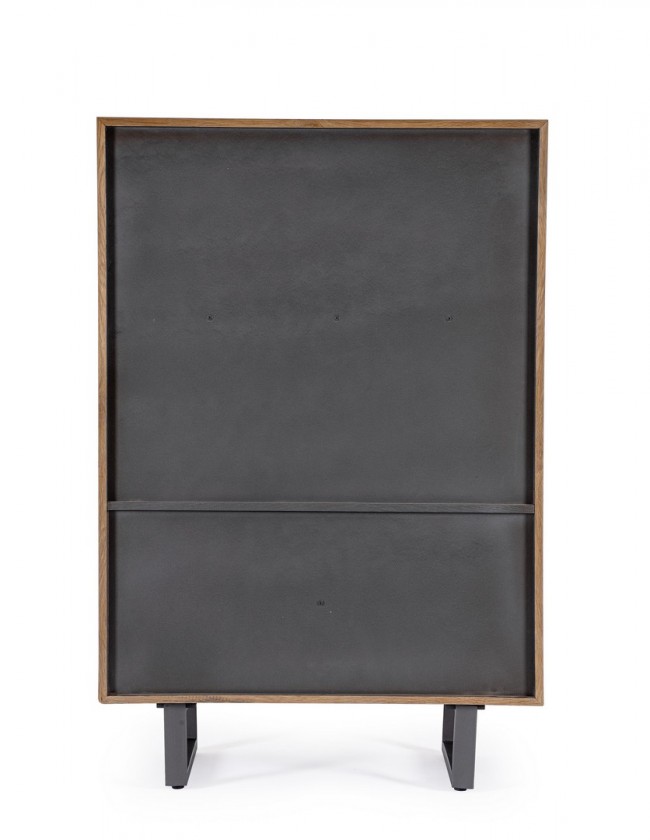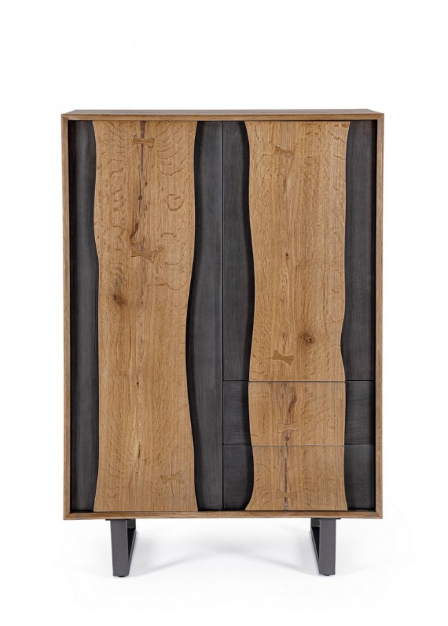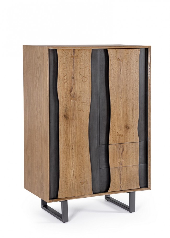 Mobile alto in MDF impiallacciato rovere con finitura naturale a vernice d’acqua, vano con mensola e cassetti dal colore antracite con chiusura ammortizzata per un’organizzazione pratica e silenziosa. Gambe in acciaio verniciato a polvere epossidica da assemblare per un tocco moderno e resistente.