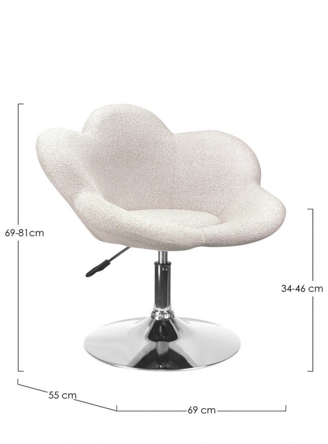 Scopri Fleur: una poltroncina elegante con struttura in acciaio cromato e imbottitura morbida in schiuma ad alta densità per un comfort duraturo. Regolabile in altezza con sistema a gas e base compatta da montare facilmente, è perfetta per dare un tocco di stile e praticità al tuo spazio.