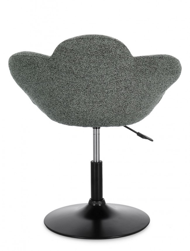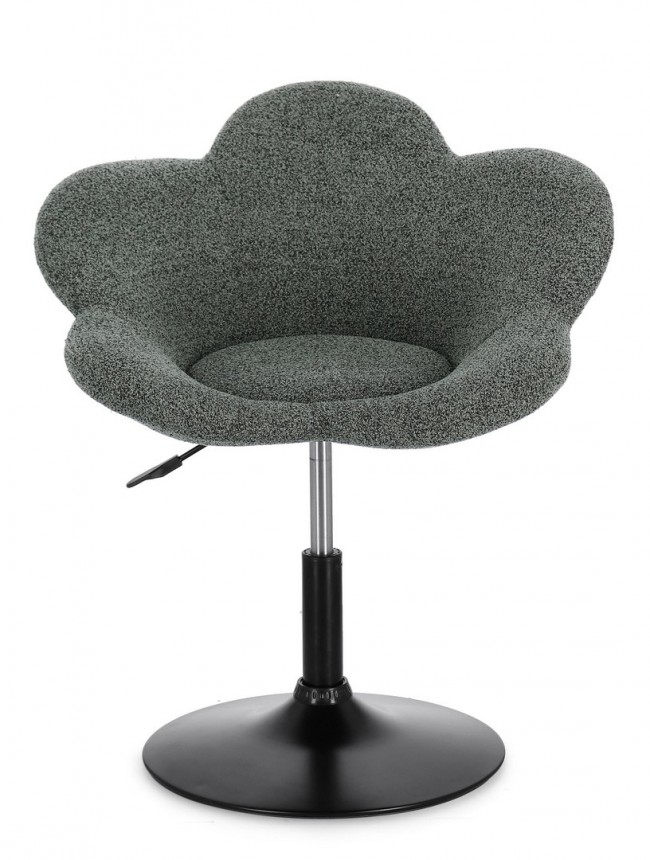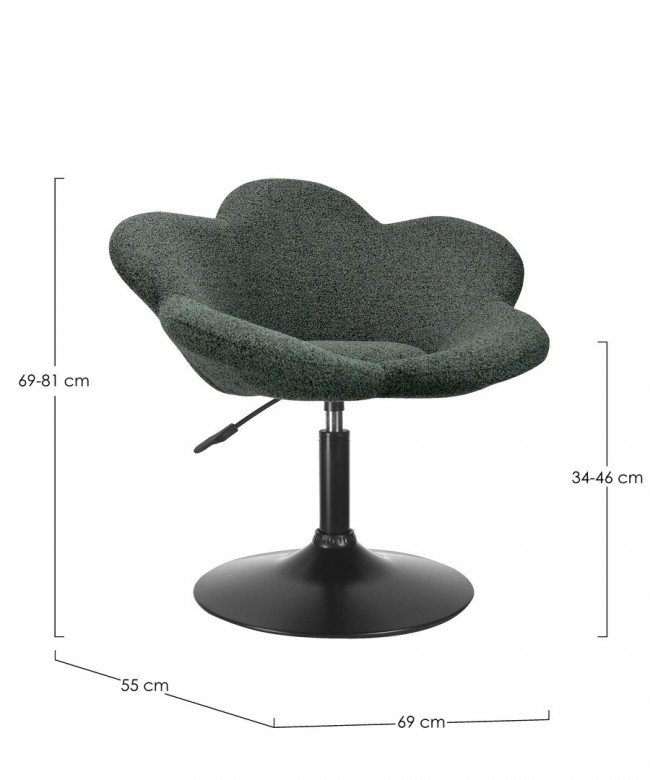 Poltroncina Fleur in nero e verde scuro: design moderno con struttura in acciaio verniciato e imbottitura confortevole in schiuma poliuretanica, rivestita in resistente poliestere. Altezza regolabile con sistema a gas e base compatta da montare facilmente per un comfort pratico e di stile.