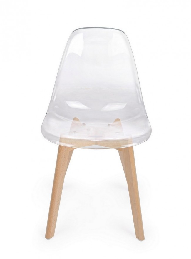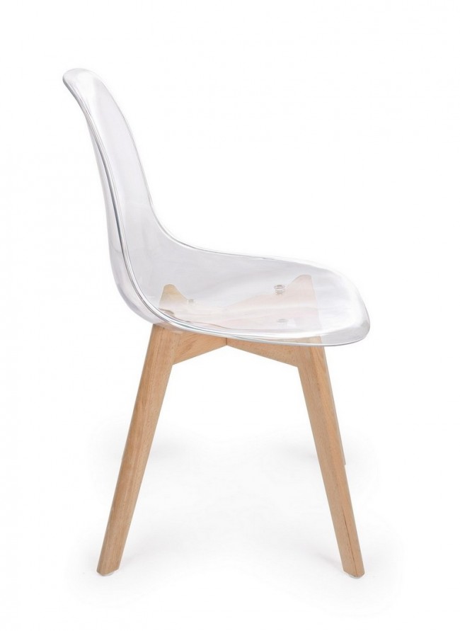 Sedia Easy trasparente con seduta e schienale in elegante policarbonato, leggera e resistente; gambe in faggio da montare per un tocco naturale e moderno. Perfetta per portare luminosità e stile funzionale in ogni ambiente della casa.