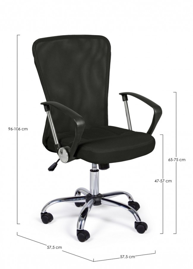 Scopri la sedia ufficio Brisbane: robusta base cromata, ruote in nylon e seduta imbottita con rivestimento in rete di poliestere per comfort e traspirabilità. Schienale in mesh, braccioli ergonomici e altezza regolabile — facile da montare per il tuo spazio di lavoro.