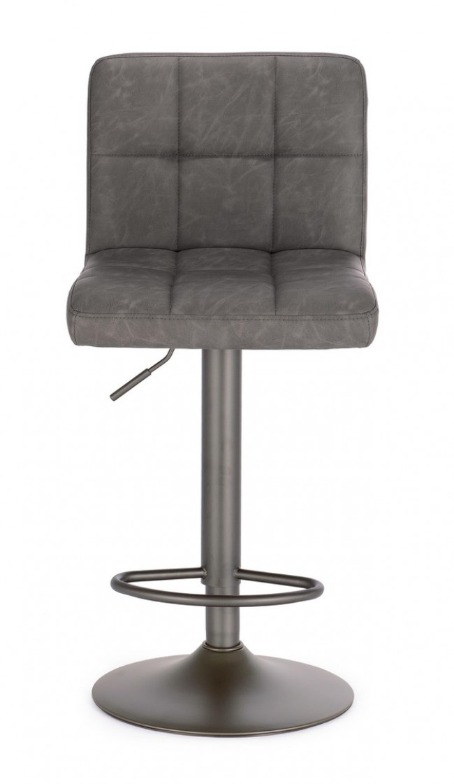 Scopri lo sgabello bar Greyson: elegante struttura in acciaio grigio opaco con base compatta Ø38 cm, seduta imbottita in schiuma nuova e riciclata e rivestimento in similpelle, altezza regolabile per adattarsi a ogni ambiente.